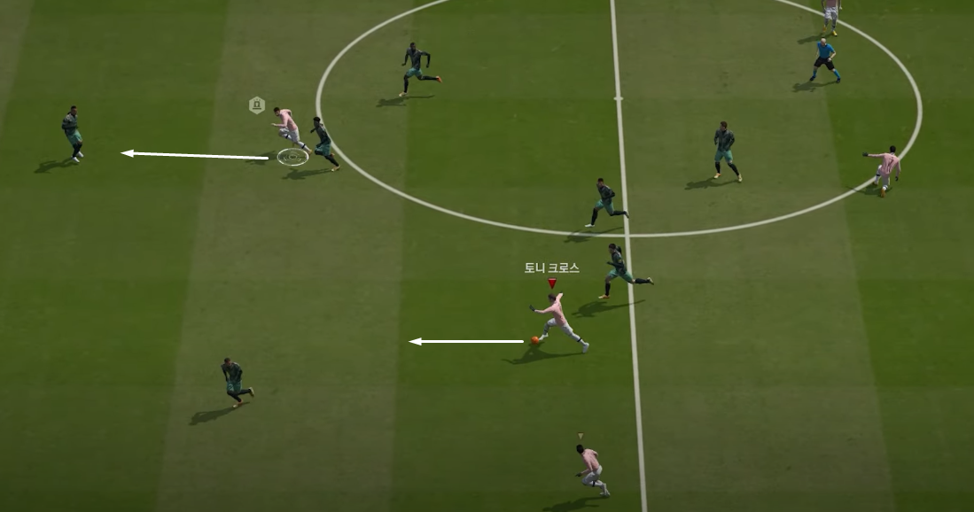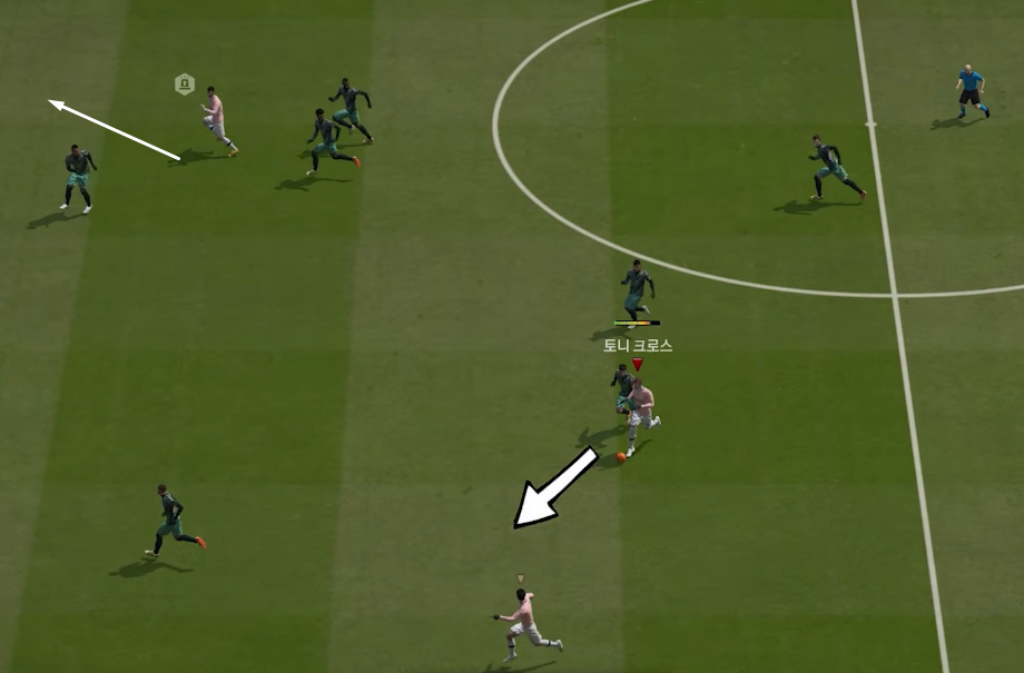 Bước tiếp theo lập tức điều chỉnh hướng chạy của cầu thủ cầm bóng theo hướng 45 độ. Nhằm kéo theo sự chú ý của hậu vệ đối phương. Như các bạn nhìn hình dưới đây, cầu thủ chơi thấp nhất của hàng phòng ngự đối phương đá bị thu hút theo hướng bóng. Mà gần như không chú ý đến tiền đạo đang xâm nhập ra phía sau.