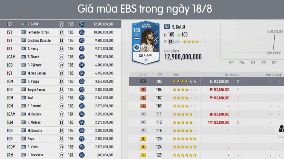 Gullit cũng tăng giá trị thêm 50%, Trong khi đó xu hướng giảm giá là tình trạng chung của thẻ EBS. Chỉ một vài trường hợp tăng giá bên cạnh hai cái tên trên là Henry ,Beckham, Basten, Pogba tuy nhiên giá trị tăng còn khá nhẹ, chưa có sự đột biến như Torres.