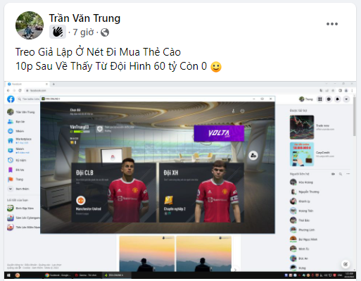 Mới đây thì trên diễn đàn FO4, câu chuyện chia sẻ rất đơn giản của một bạn có tên Trần Văn Trung về việc treo GLXH ở quán nét để chạy đi mua thẻ cào ( có thể quán hết thẻ hoặc chủ quán không có ở đó ) nhưng khi quay lại khoảng 10 phút đồng hồ. Nick Fo4 yêu quý của bạn Trung đã bay màu từ 60 tỷ BP xuống 0 BP. Câu chuyện vừa bi vừa hài này có lẽ không hiếm với tựa game FO khi mà rất nhiều nạn nhân chỉ vì có chút việc treo nick ở quán và khi quay lại thì ôi thôi... bao công sức đã bỏ sông bỏ bể