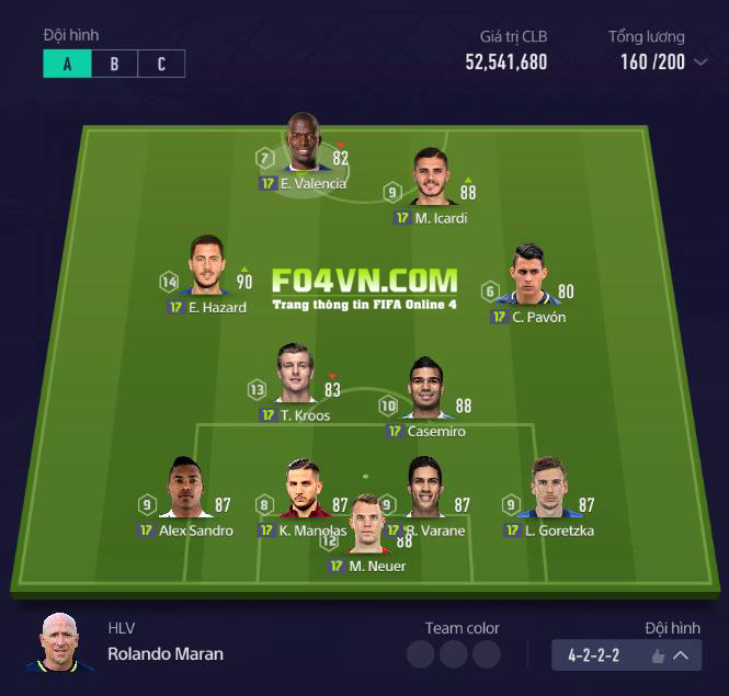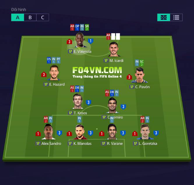 Ở đây mình dùng 2 CDM chạy khá chậm là Toni Kroos 17 và Casemiro 17. Một người thủ tốt, một người hai chân 5-5 và chuyền phát động tấn công cực chuẩn.