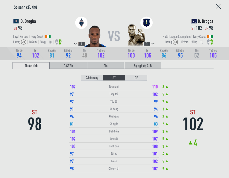 Hiện tại Drogba mới chỉ ra mắt đúng 3 mùa giải trong game, ngoài trừ mùa ICON với mức giá đắt đỏ ra. Người chơi thường lựa chọn là LH hoặc MC. Tuy nhiên sự chênh lệch về mức lương cùng với chỉ số, đôi khi làm bạn không biết chọn lựa mùa giải nào cho vị thần sức mạnh này. Sau đây là những đánh giá của Fo4vn