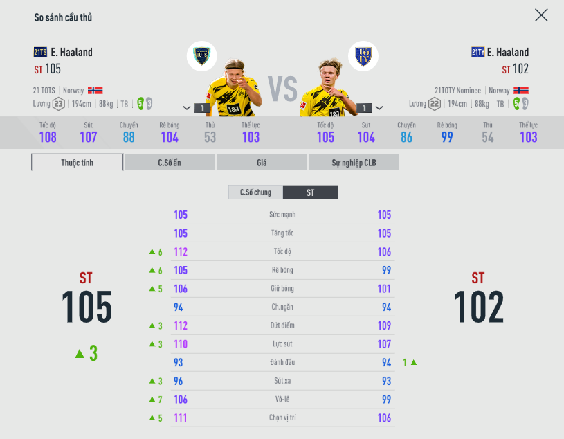 Tiền đạo người Na Uy đã có một mùa giải thành công với Dortmund. Tuy nhiên khi ra mắt thì mùa giải 21TS của Haaland lại có chỉ số vượt trội so với 21TY trước đó. 3 chỉ số và mức lương chỉ hơn có 1 đơn vị. Điều này làm người chơi cảm thấy rất phân vân liệu mùa giải 21TS có thực sự chất lượng hơn 21TY hay không. Liệu có chuyện mùa sau phủ nhận mùa giải trước. Hãy cùng chúng tôi đi tìm lời giải đáp cho vẫn đề này.