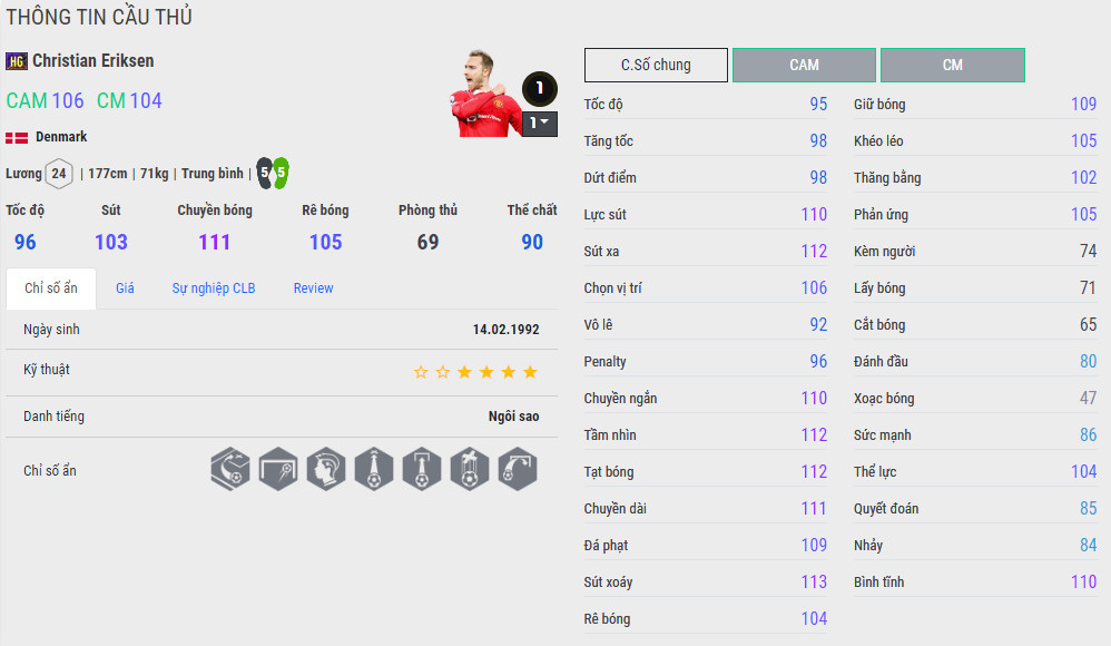 Bạn cần một cầu thủ chơi tiền vệ trung tâm có thể chuyền tốt bằng hai chân, sút xa như hack ? thì bạn đã có rồi đấy. Eriksen HG là phiên bản có chỉ số ẩn bá đạo nhất của tiền vệ này từ trước đến giờ, có cả tinh tế lẫn sút xa và sở hữu chỉ số lực sút cũng như sút xa đều trên 110.