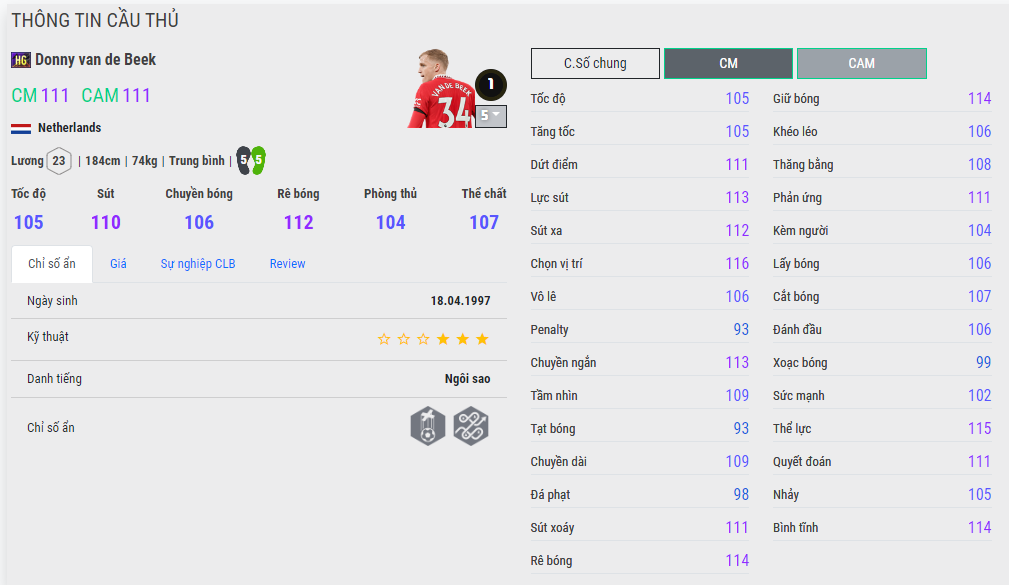 De Beek mùa HG có một bộ chỉ số có thể coi là toàn diện ở vị trí tiền vệ, cầu thủ người Hà Lan chỉ có hai vị trí chỉ định là CM và CAM nhưng lại có thể chơi cực tốt ở CDM, với khả năng cắt bóng cực ổn và đang là một hàng hót tại sever Hàn với những ai là fan của MU. Van De Beek có thể hình ổn, hai chân 5/5 và đăc biệt là biết chuyền, biết sút... chừng đó là quá đủ để có thể kết hợp với Casemiro trong đội hình của MU hiện tại rồi.