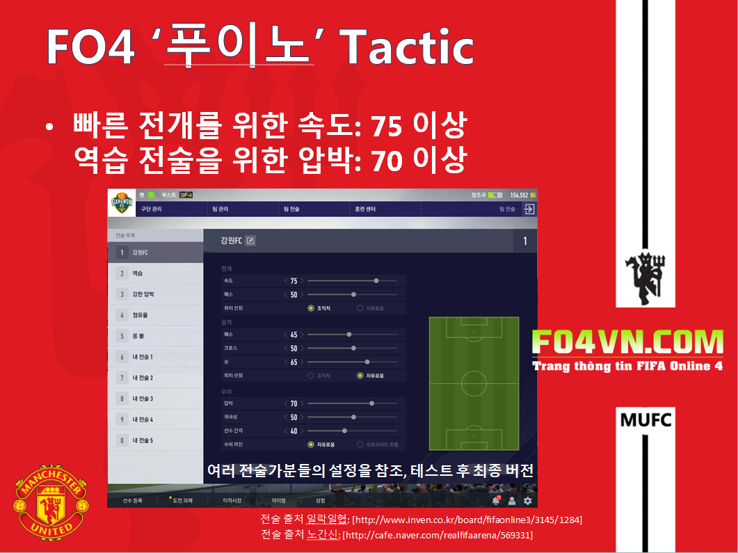 Tổng quát : Tốc độ chơi 75 cùng với mức chuyền 50 sẽ đẩy nhanh các đợt tấn công của đội hình, cùng với đó, tốc độ cao sẽ giúp 2 cánh đẩy mạnh khả năng dốc biên hơn. Xu hướng chơi tổ chức sẽ hạn chế việc di chuyển sai vị trí của các cầu thủ.