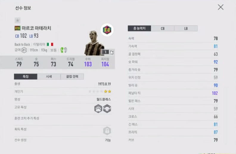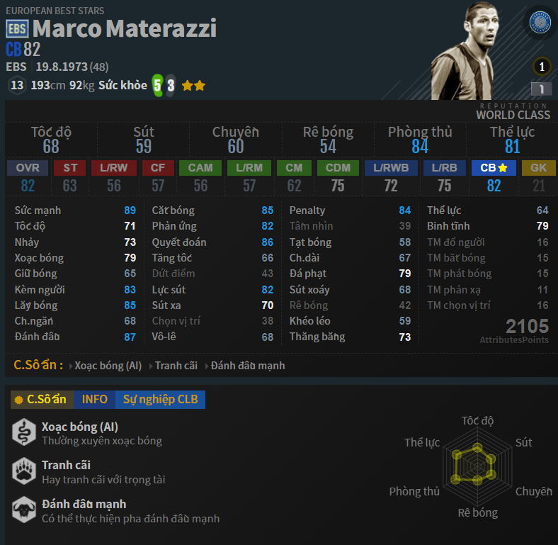 Trước đây Materazzi từng có mùa giải NHD và TT. Nhưng không hiểu vì lý do nào đó mà huyền thoại của Inter Milan sau đó biến mất hoàn toàn khỏi game. Giờ đây thì anh chàng khổng lồ này đã trở lại và có lẽ sẵn sàng cạnh tranh với các siêu trung vệ khác trong game.