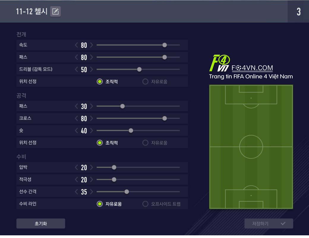 Tốc độ và chuyền bóng ở mức cao 80. Để đội hình dâng nhanh khi tổ chức phản công.