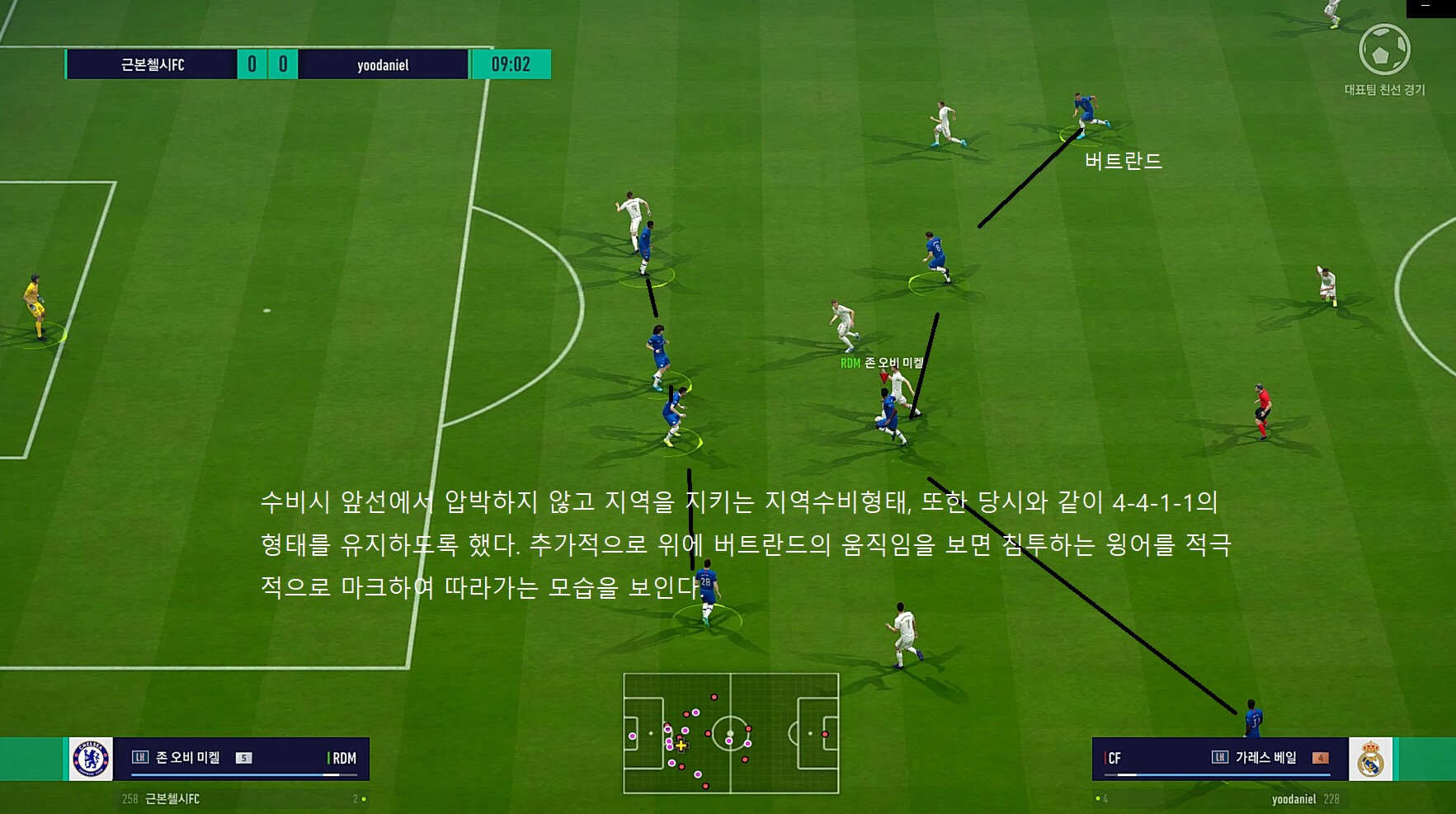 Với các chỉ số phòng ngự để thấp, giúp cho hàng phòng ngự được tổ chức tốt hơn, như hình trên là đội hình chelsea khi lùi về tham gia phòng ngự. Các bạn có thể dễ dàng nhận ra trên mini map tuyến phòng ngự 2 lớp giăng ngang.