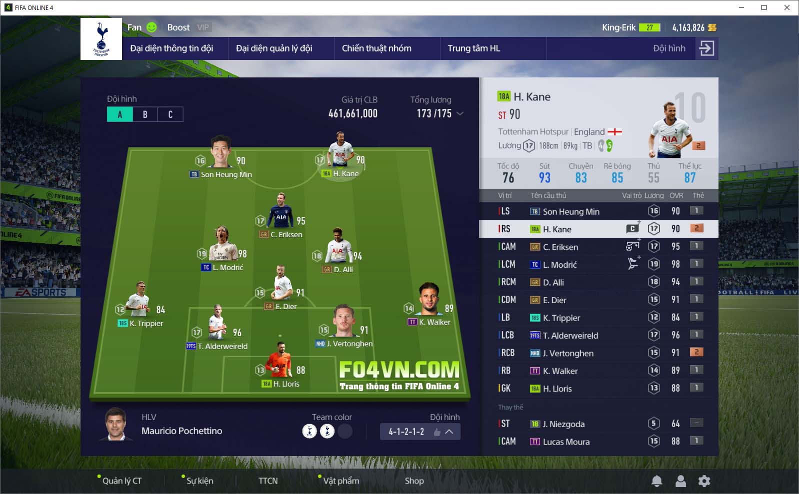 Điểm mạnh của team này là hàng tiền vệ 4 người đều có kĩ năng chuyền tốt, sút xa tốt. Tranh chấp cũng khá. Kiểm soát tuyến giữa không gặp nhiều khó khăn. Trong khi đó hàng tiền đạo cặp đôi Harry - Son khá tuyệt vời, 1 to khỏe làm tường ổn, 1 cơ động kĩ viện và tốc độ tốt. Cả 2 đều có kỹ năng sút bằng chân tuyệt vời. Hiệu suất ghi bàn sau 10 trận của 2 ông này dao động khoảng 7-8 bàn.