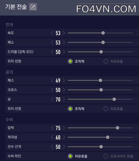 Bộ 3 tiền vệ trung tâm không có thiết lập nào. Trong khi đó vị trí hậu vệ cánh là thiết lập hạn chế dâng cao nhằm tránh việc những vị trí cánh đá giẫm chân nhau.