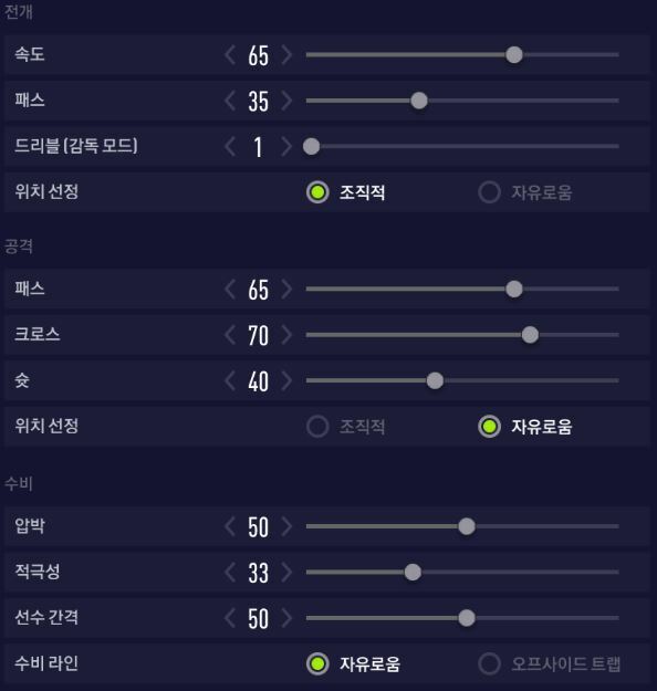 Có thể nhận ra là hai trung vệ được thiết lập tự do, không gò bó để hoạt động theo đúng AI của hai cầu thủ, trong khi đó hai hậu vệ cánh là đánh chặn bị động để hạn chế việc xông lên của hai cầu thủ này, cả hai đều là những cầu thủ không mạnh mẽ ở khoản tackle bóng, nên khi bạn đá với áp lực cao việc thiết lập này sẽ giúp cho hai cầu thủ lao vào một cách vồ vập làm hổng tuyến phòng thủ của đội hình.
