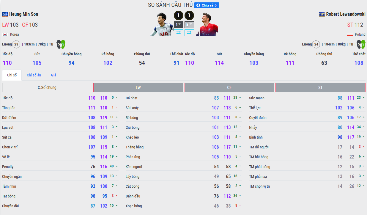 Ví dụ trường hợp của Son Heung Min Cap và Lewandowski 21TY +5 các bạn sẽ thấy cùng chỉ số nhưng khi sử dụng luôn nhận thấy Son Hueng Min lướt hơn khá nhiều