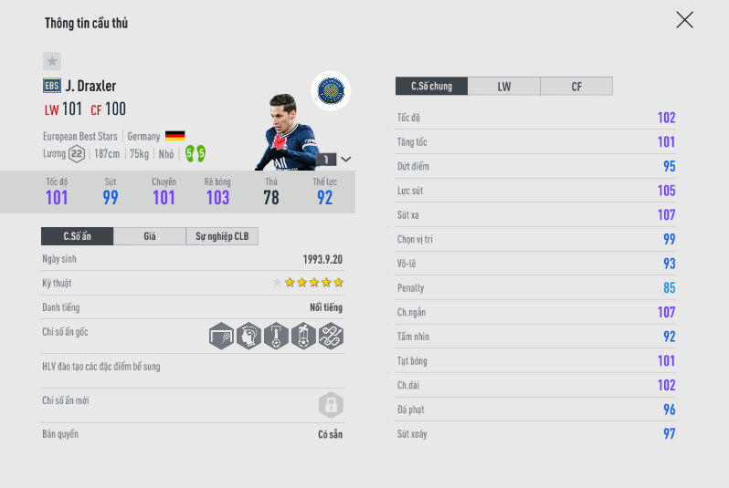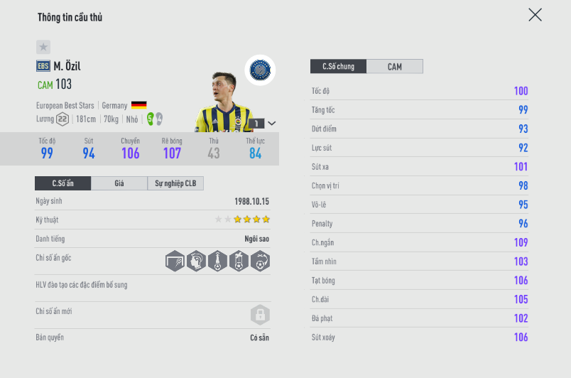 Điểm khác lạ là mùa giải EBS Ozil có hai chân 5/4 qua đó giúp tiền vệ này có thể chuyền tốt cả hai chân, và đa dạng hơn trong cách phân phối bóng. Mức lương của Ozil là hơi cao nhưng nếu bạn biết rằng tỷ lệ kiến tạo thành bàn của Ozil được Nexon thống kê lên tới 0.7 bàn/trận thì bạn có muốn thử qua không ?
