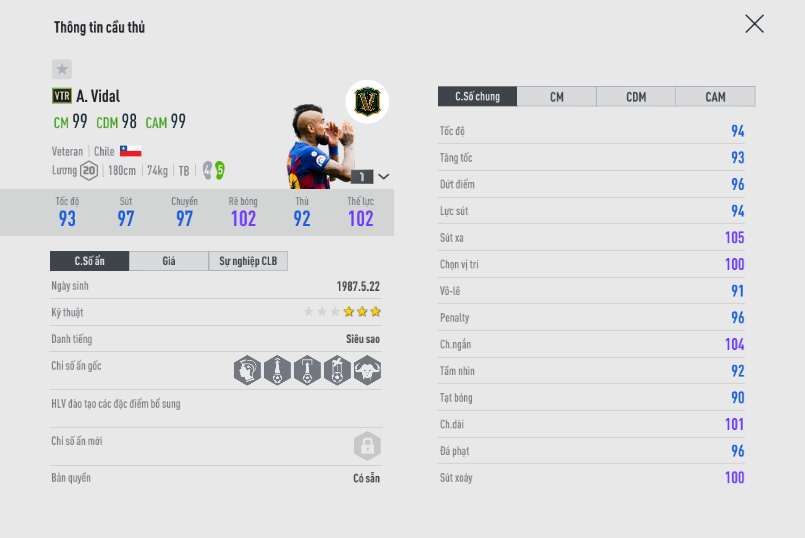 Có lẽ một số bạn sẽ nói rằng Vidal thì có gì là lạ. Thế nhưng nếu tính vào tần suất xuất hiện thì Vidal khá hiếm gặp. Thực tế thì cầu thủ người Chile lại làm rất tốt ở chế độ GLXH. Cân bằng giữa công thủ thêm vào đó là nền tảng thế lực cực khỏe