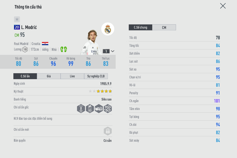 Nhỏ con, sức khỏe yếu nhưng vẫn là ngôi sao sáng của Real cho thấy đẳng cấp chơi bóng của Modric cao đến thế nào. Là linh hồn, bộ não của đội bóng, bạn đừng vội chê chỉ số của anh, hãy thử xem đảm bảo sẽ bất ngờ đấy. Hiệu xuất ghi bàn thậm chí còn cao hơn cả Ballack MC