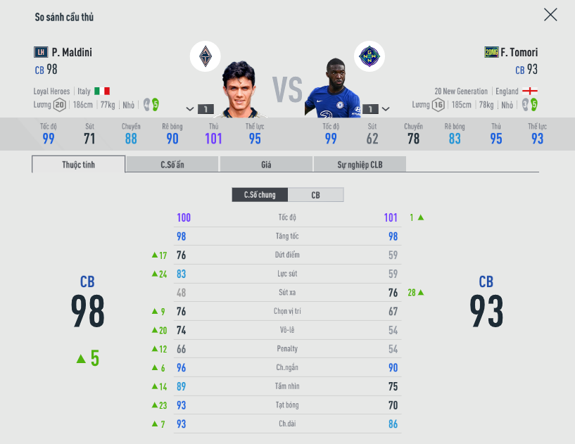 Cặp đôi của Milan dành cho các fan của CLB này. Không phải Nesta như ngoài đời, Maldini trong game kết hợp với Tomori NG mới chính là lá chắn thép cho hàng phòng ngự của Milan. Một Maldini quá khôn và một Tomori đây nhanh nhẹn cũng như khả năng đánh chặn không hề thua kém bất cứ con hàng top nào trong game. Xu hướng của cặp đôi này cũng là 2/3 và 2/2. Chiều cao không phải là thế mạnh của hai cầu thủ này, tuy nhiên bạn có thể hoàn toàn an tâm vì bóng bổng quan trọng trước hết là chọn vị trí, mà điều này thì cả hai đều có thừa