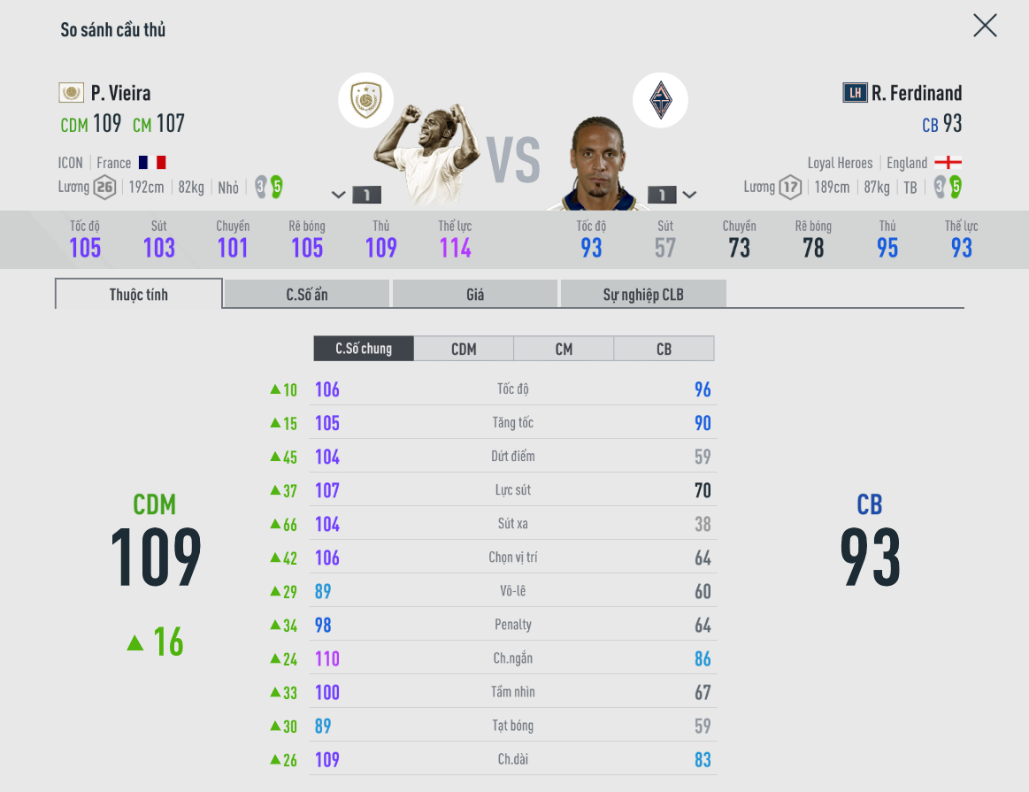 Năng lực của Vieira chắc các bạn không cần phải giới thiệu nhiều, thậm chí cảm giác Vieira chơi CB còn tốt hơn là chơi CDM. Mặc dù sự kết hợp này ít được chú ý, nhưng quả thực nó lại đem hiệu quả bất ngờ. Tất nhiên nếu bạn không thể sắm cho mình Vieira ICON thì có thể thay bằng mùa giải NHD với giá thành rẻ hơn và chất lượng sử dụng cũng không hề thấp chút nào. Vieira mạnh trong không chiến, tranh chấp bọc lót, trong khi đó Rio lại một hình mẫu đánh chặn điển hình
