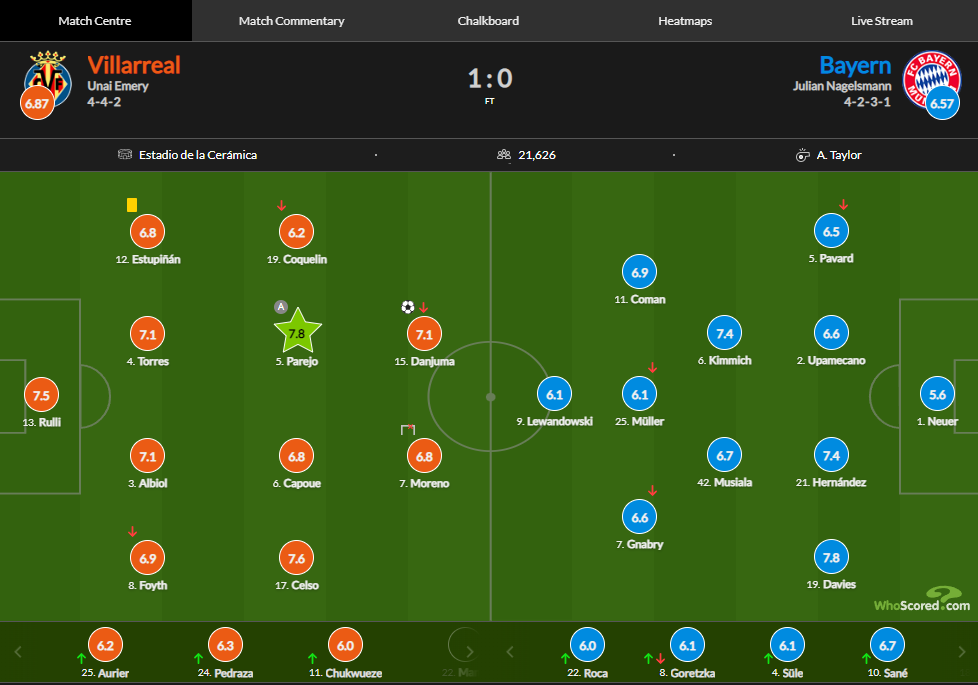 Villarreal đã gây ra bất ngờ khi đánh bại Bayern với tỷ số chung cuộc là 2-1. Với việc có chỉ số khởi điểm các cầu thủ thấp, Villarreal dự đoán sẽ tăng chỉ số nhiều cầu thủ