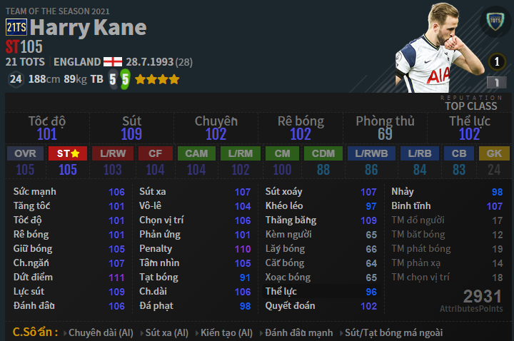 Cầu thủ đúng đầu danh sách này chính là tiền đạo người Anh. Tại sao Kane lại đang hot như vậy thì bạn cứ nhìn vào chỉ số chiều cao, cân nặng và sức mạnh của anh chàng này xem. Mọi thứ quá hoàn hảo cho một meta 6.0. Chưa kể tốc độ của Kane cũng chẳng phải dạng chậm chạm chỉ, hai chân 5/5. Hoàn hảo