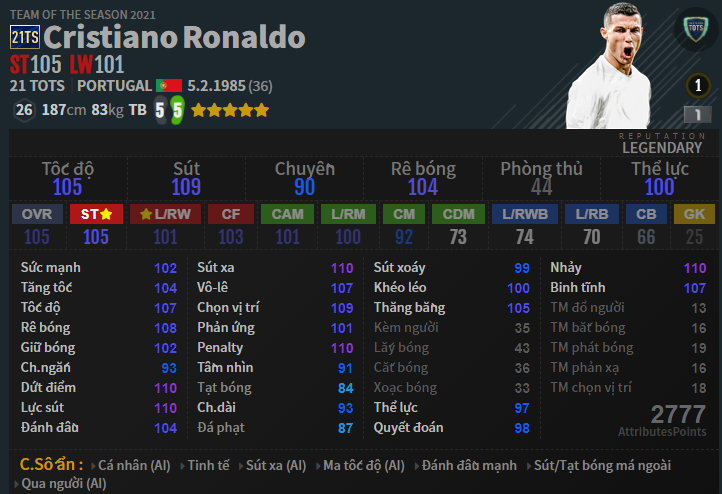 Fo4vn sẽ sớm ra mắt bài viết so sánh giữa Ronaldo 21TY và 21TS dành cho các bạn, nhưng có thể khẳng định mùa 21TS rất ngon, thậm chí so với 21TY Ronaldo còn có đánh đầu mạnh, và bỏ đi chỉ số ăn vạ. Một sát thủ toàn diện hơn chăng?