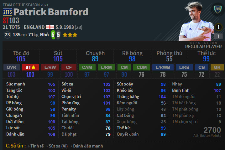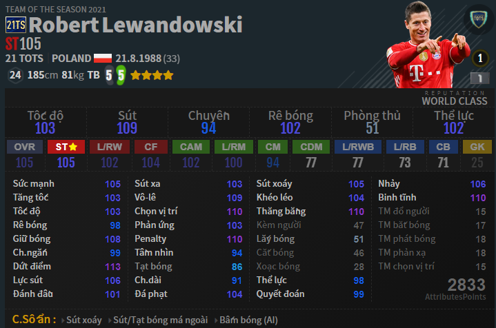 Tiền đạo người Ba Lan có một mùa giải trong mơ, khi anh phá vỡ kỷ lục của huyền thoại Gerd Muller. Trở thành chân sút số 1 trong lịch sử giải đấu nước Đức. Tăng thêm 1cm và 1kg, nhưng sẽ là cực kỳ quan trọng với một tiền đạo ingame đấy