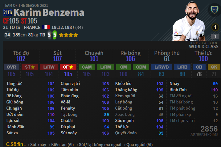 Có vẻ Nexon đang muốn mọi tiền đạo đều có hai chân 5/5 thì phải, đây là cái tên thứ 4 có kỹ năng 5 sao cả hai chân. Nhưng không thể phủ nhận Benzema không chỉ là một tiền đạo tốt, anh còn phối hợp và kiến tạo cho đồng đội cực đỉnh. Người có thể đá cặp với bất kỳ ai