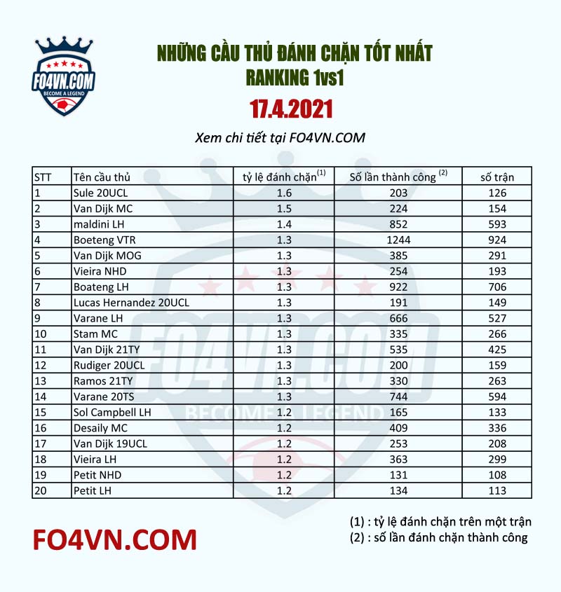 Chúng ta sẽ đến với một trong những tiêu chí nữa để đánh giá một cầu thủ phòng ngự giỏi đó là khả năng đánh chặn tốt nhất. Và để xem có những sự thay đổi nào so với thống kê gần đây nhất ( xem thống kê 24.3.2021 )