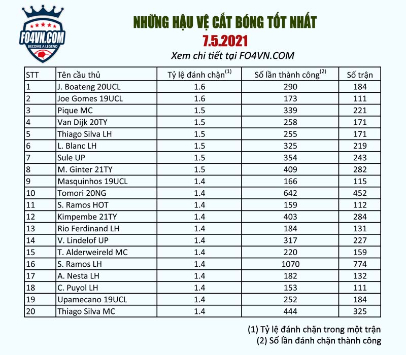 Dưới đây là thống kê những cầu thủ đánh chặn hay nhất trong top 5000 ranking