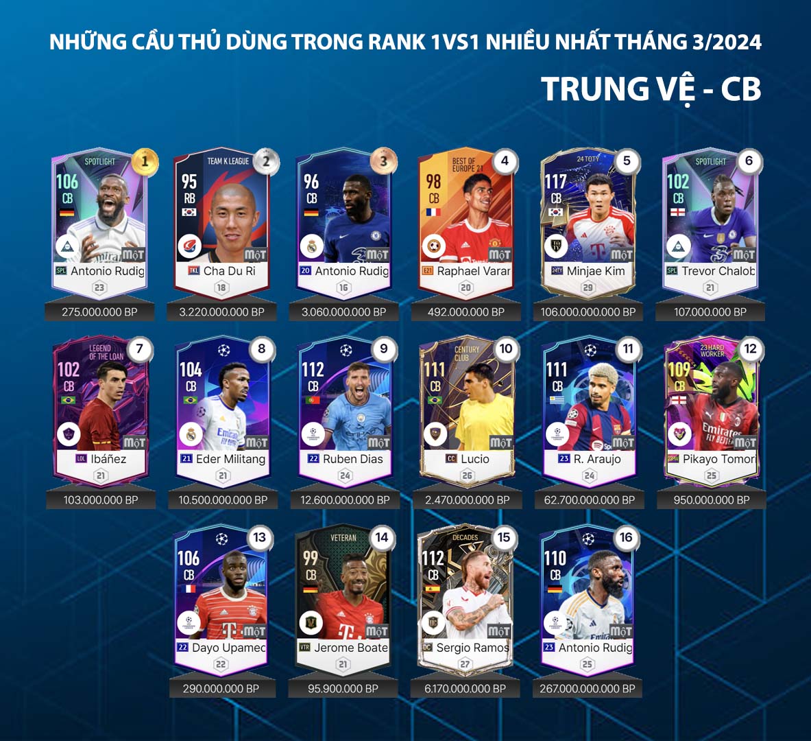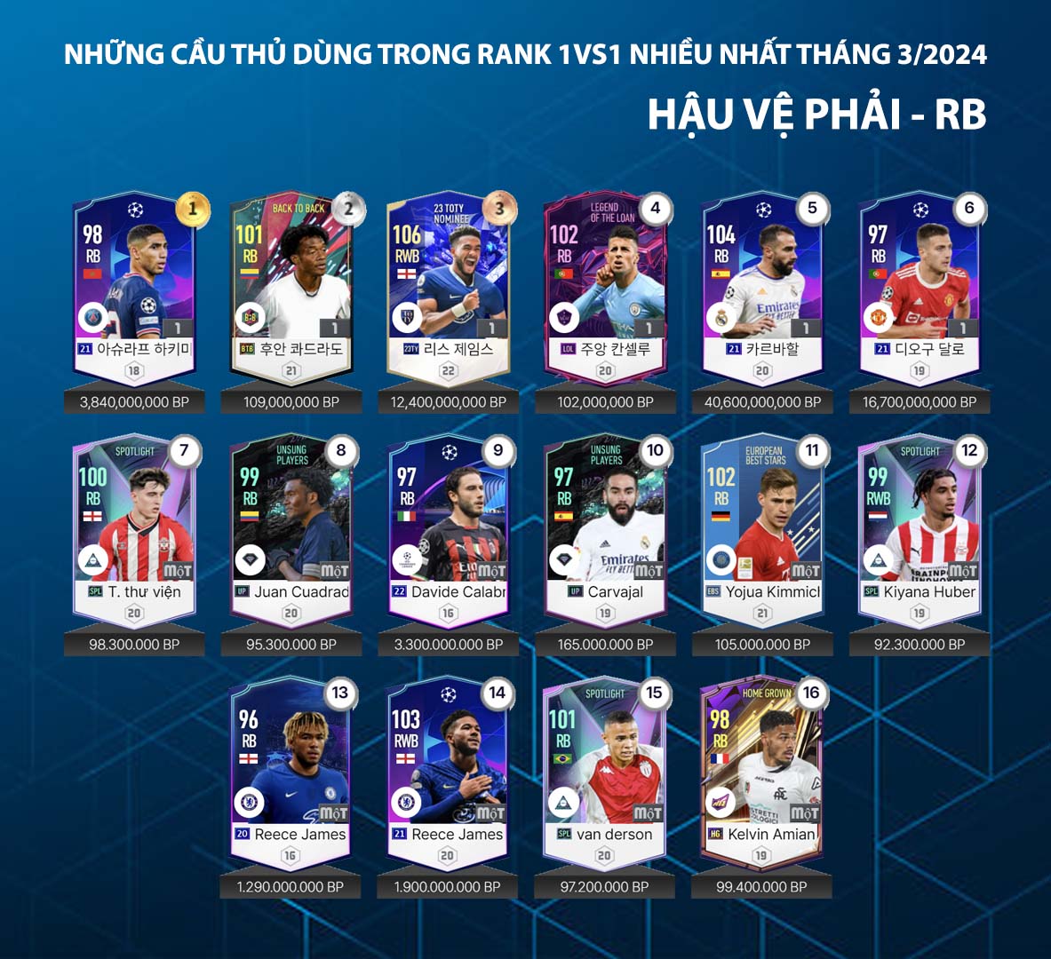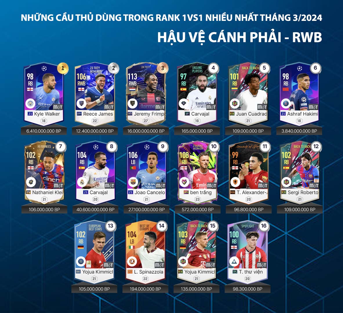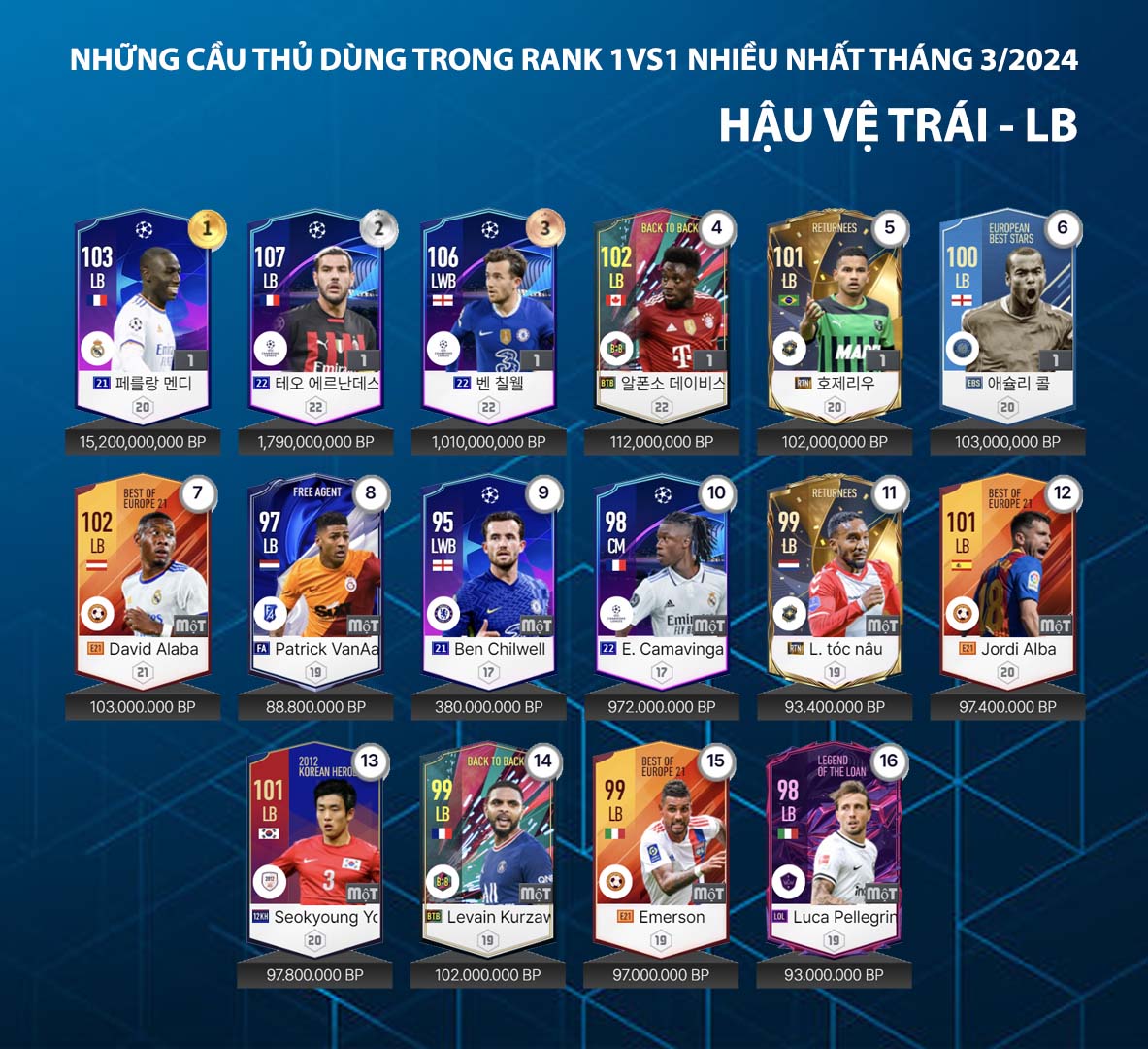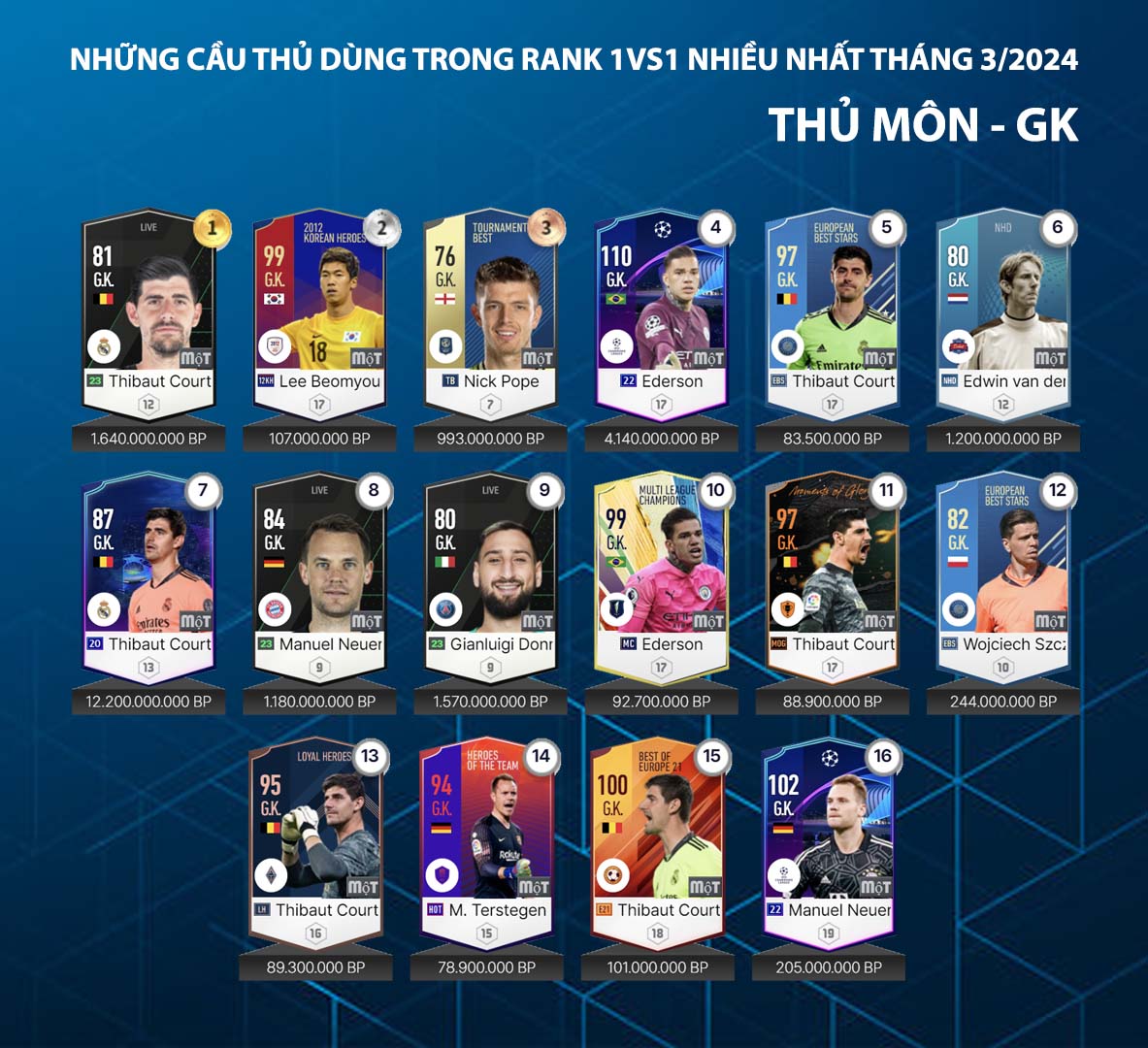 Danh sách dưới đây được thống kê từ máy chủ về những cái tên được sử dụng nhiều nhất trong tháng qua của những game thủ rank cao tại máy chủ xếp hạng. Đây được xem là một trong những nội dung tham khảo đáng quan tâm và care1997.com.tw hôm nay gửi tới cho các bạn danh sách những hậu vệ và thủ môn được sử dụng nhiều nhất trong tháng 3.
