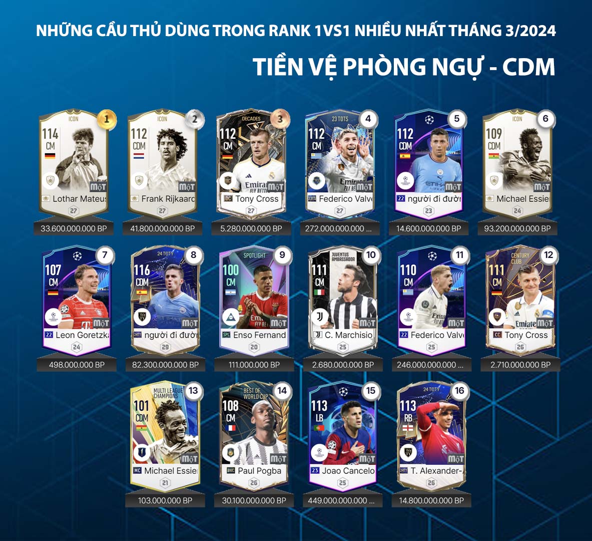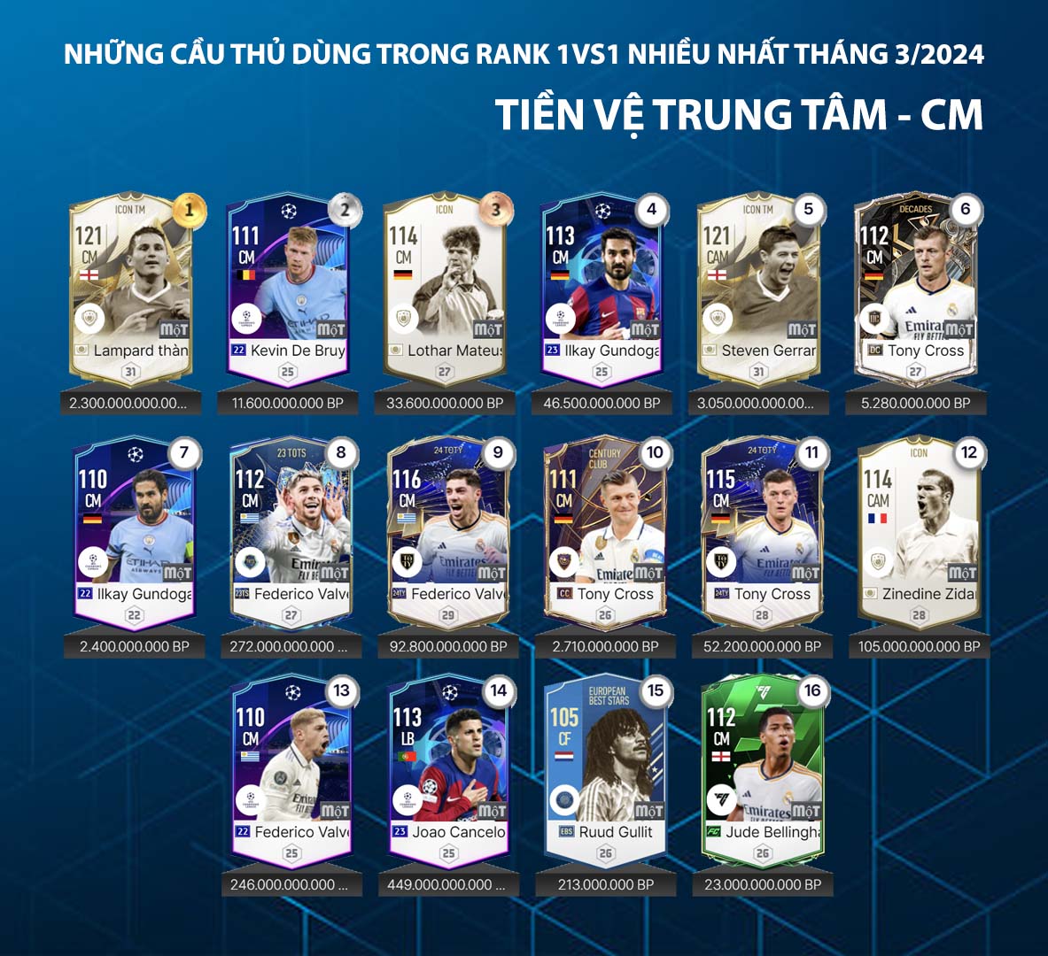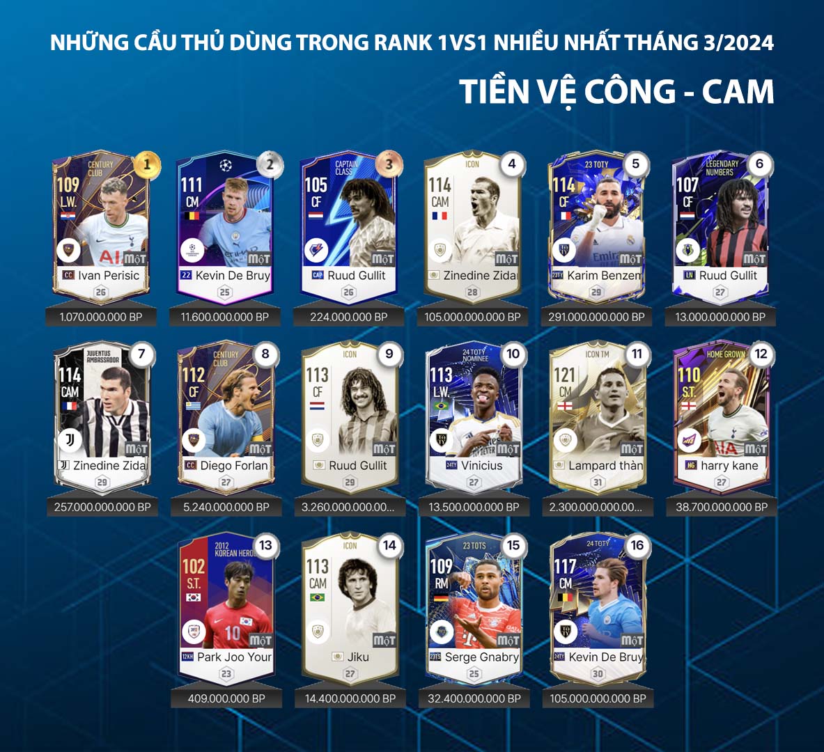 Trong FC Online, ở rank xếp hạng vị trí tiền vệ thời điểm hiện tại chú trọng sự toàn diện ở cả 2 chân, khả năng chuyền bóng tốt và kỹ năng sút xa và hỗ trợ tấn công hiệu quả khi cần. Điều quan trọng ở sự hiệu quả thay vì sử dụng những cầu thủ chi phí cao thì nhiều cầu thủ chi phí thấp lại có chỗ đứng và cho thấy phong độ ổn định ở rank xếp hạng đơn.
