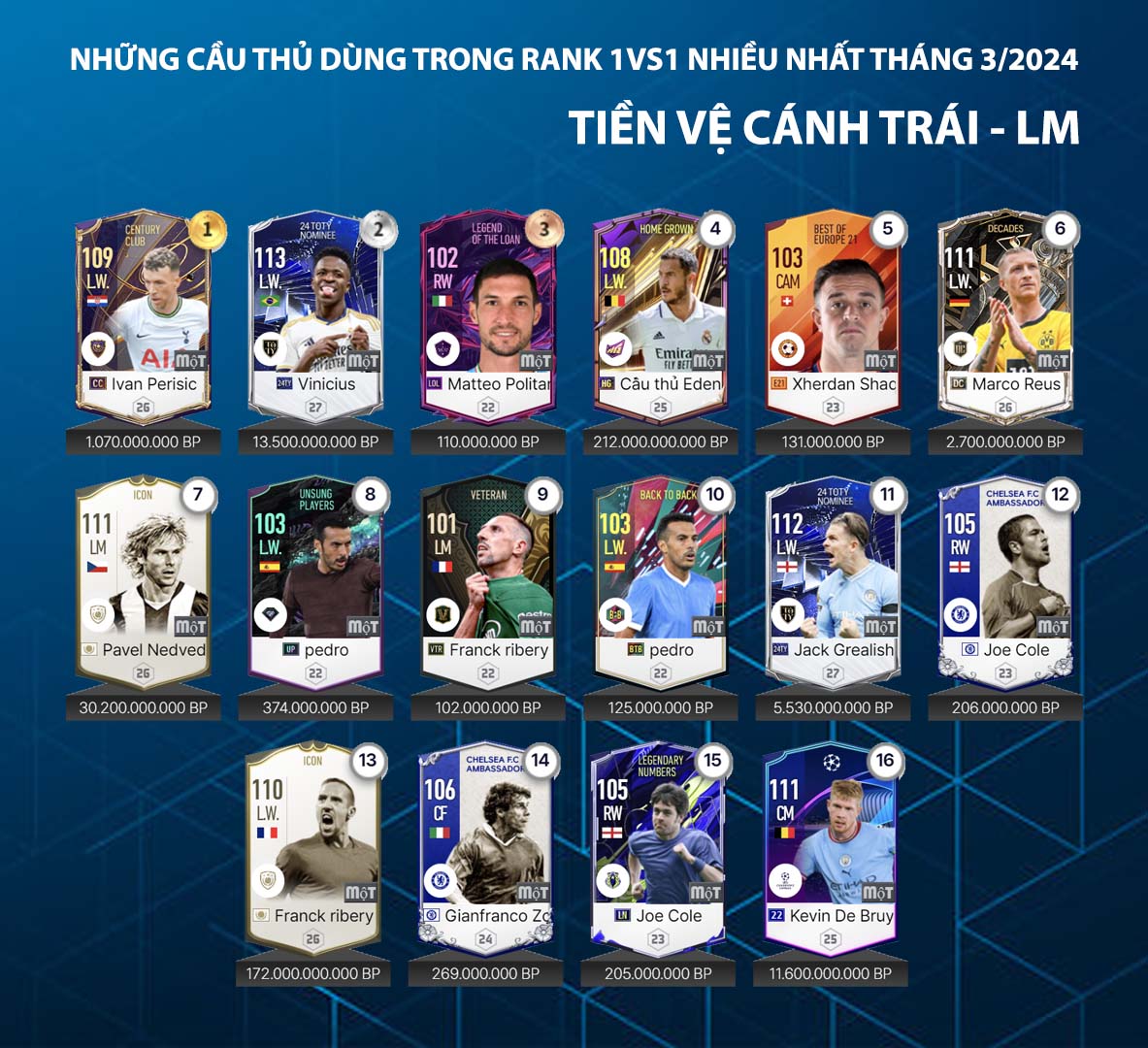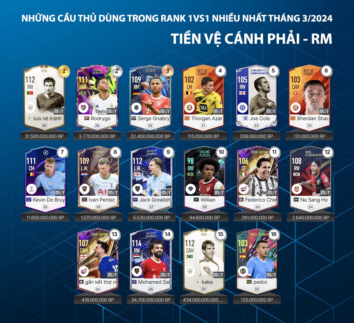 Danh sách dưới đây được thống kê từ máy chủ về những cái tên được sử dụng nhiều nhất trong tháng qua của những game thủ rank cao tại máy chủ xếp hạng. Đây được xem là một trong những nội dung tham khảo đáng quan tâm và care1997.com.tw hôm nay gửi tới cho các bạn danh sách những tiền vệ được sử dụng nhiều nhất trong tháng 3.