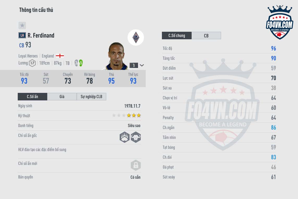Trung vệ đội tuyển anh và MU trong game có mùa giải cao nhất là ICON. Tuy nhiên giá để sở hữu anh là không đơn giản chút nào. Mặc dù vậy, mùa giải LH của Rio Ferdinand lại mang đến hiệu quả rất tốt trong đấu trường này. Cao to cùng sải chân dài, AI cắt bóng đeo bám thông minh. Đặc biệt là Rio hay có những pha xoạc bóng cứu nguy cực chất trong vòng cấm