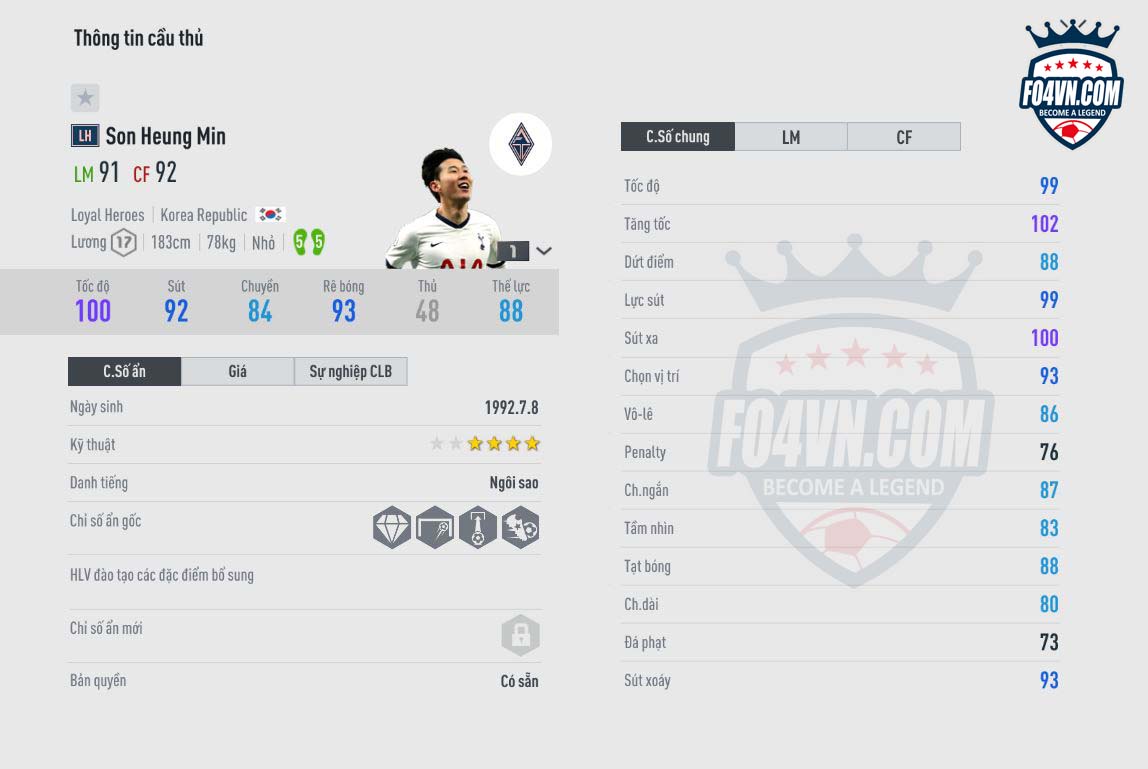Niềm tự hào của châu á đang chơi cực thăng hoa tại trời âu. Son với hai chân 5/5 cùng các chỉ số ẩn tuyển cho chế độ GLXH. Thường xuyên ghi bàn, khả năng bắn phá cực tốt. Không ngoa khi nói Son như con đẻ của Nexon vậy. Dù trong chế độ 1vs1 bạn có dùng anh ấy không hiệu quả thì đó là lỗi của bạn. chứ trong GLXH thì Son như một vị thần với hiệu xuất ghi bàn khủng dù đá ở cánh.