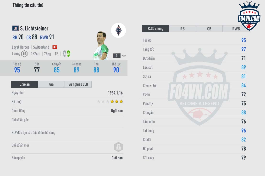 Hậu vệ cánh hay một thời của Juvetus có lẽ khá bất ngờ với nhiều người. Tuy nhiên với chỉ số đồng đều như một Gullit bản fake. Lichtsteiner chơi bao cánh, và đặc biệt khi lên tham gia tấn công hay chồng biên. Cầu thủ người Thụy Sỹ thường xuyên có những tình huống đi bóng vào trong đầy nguy hiểm. Thể lực bao sân và đeo bám rát.