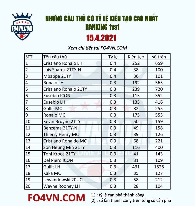 Bóng đá hiện đại ngoài chú ý đến người ghi bàn, người ta còn tính xem ai là người đã tung ra đường chuyền quyết định giúp đồng đội có thể đưa bóng vào lưới đối phương. Trong Fo4 thì hiện nay trong trận đấu không hiển thị người kiến tạo khi ghi bàn nữa, chúng ta chỉ có thể biết được sau khi xem thông số sau trận đấu. Và những cái tên dưới đây là những chân kiến tạo tốt nhất. Thống kê trong top 500 ranking