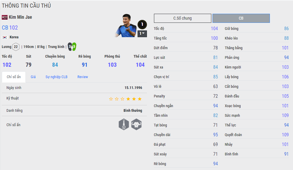 Vâng nếu bạn thắc mắc tại sao lại có anh chàng Hàn Quốc này ở đây thì bạn hãy nhìn chỉ số của trung vệ đang chơi cho Napoli này bạn sẽ rất shock đấy. Thực ra thì anh này chơi rất tốt trong màu áo Napoli mà có tài năng thực sự, việc đóng góp lớn vào việc đưa đội tuyển Hàn Quốc đến với Qatar 2022 đã giúp cho Kim Min Jae được Nexon ưu ái cho bộ chỉ số tuyệt đẹp, tiện thể bồi thêm cho hai chỉ số ẩn mà mùa SPL còn chưa có. Giờ đây Kim đã thực sự trở thành một cái tên đáng gờm đấy.