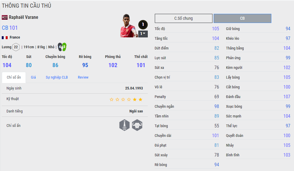 Nếu bạn thắc mắc tại sao Varane WC22 lại được nhiều người ưa chuộng thì hãy nhìn vào hai chân của anh chàng này, Varane mùa này đã được chân 4 chân 5. Trong khi đó chỉ số tốc độ, tăng tốc không hề thấp một chút nào nhưng Ovr tổng chỉ cố 101. Bạn hoàn toàn có thể có được mức thẻ +5 +7 để gia tăng sức mạnh cho đội hình mà giá thành cũng tương đối dễ chịu. Chưa bàn đến chất lượng ra sao chỉ với cái tên Varane luôn được Nexon ưu ái đã là đủ để xúc rồi đúng không ?