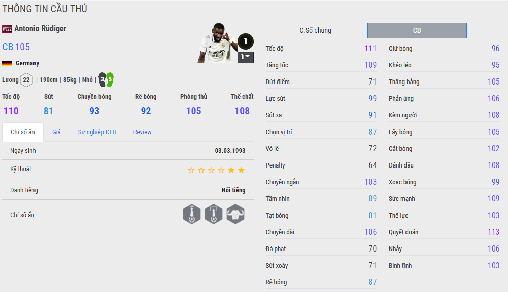 Dù đã có thêm mùa SPL mới ra gần đây và garena cũng mới có động thái fix giá mùa 22TY thì cái tên Rudiger WC22 vẫn đang rất hot. Thể chất của anh chàng được nâng cấp hơn một chút dù tốc độ vẫn giữ nguyên như vậy. Ở phiên bản SPL thì Rudiger có cả ma tốc độ, một chỉ số ẩn khá thừa với một trung vệ.
