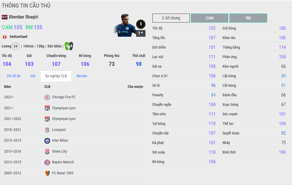 Là linh hồn của đội tuyển Thụy Sỹ, điểm mạnh nhất của cựu cầu thủ Liverpool này chính là hai chân 5/5 và một thể trạng rất rắn chắc, dáng chạy của Shaqiri trong game rất dễ nhận ra và cũng rất khó để tóm gọn anh chàng này dù chỉ số tốc độ không phải là nhanh so với mặt bằng chung. Việc có một thăng bằng quá tốt giúp những tình huống đột phá từ biên vào của Shaqiri là cực ổn, thêm những pha tạt bóng chuẩn chỉ ở meta này càng cần thiết hơn