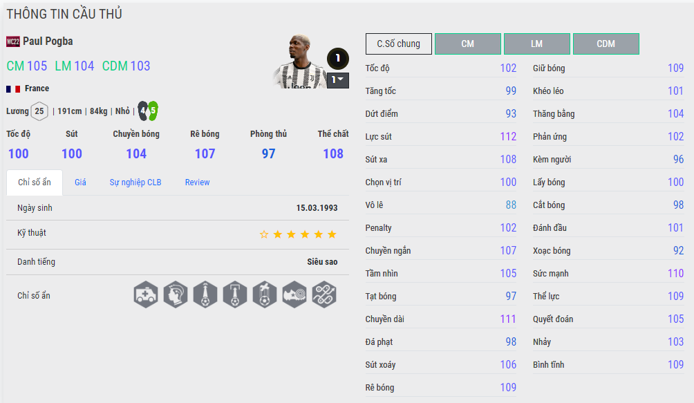 Mùa WC22 là mùa giải mà Pogba được khoác áo đội tuyển quốc gia và mặc định Nexon lại build anh ngon hơn hẳn. Cho dù năm này Pogba cũng không có cơ hội đến Qatar vì chấn thương nhưng dù sao nhìn vào dàn chỉ số ẩn của Pogba đã cảm thấy chất lượng rồi.