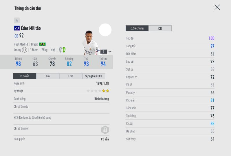 Với mức lương thấp, chỉ số cũng chỉ có 92. Đây là một cơ hội cho các HLV nâng cấp cầu thủ này lên +8. Tuy chỉ số thấp như vậy nhưng tốc độ của Militao là cực tốt, AI phòng ngự cũng rất tốt. Nếu bạn cần một vị trí giảm lương cho đội hình của mình thì cầu thủ của Real hoàn toàn có thể cân tốt mà không hề thua kém các top CB hay RB