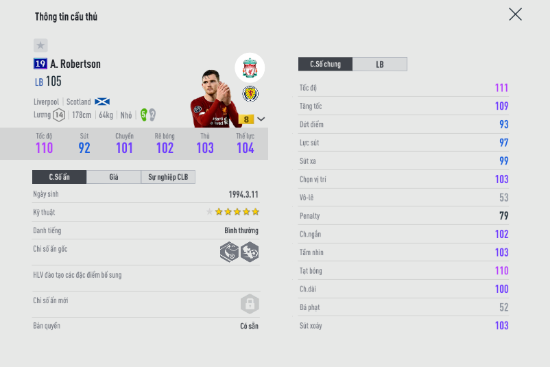 Mùa giải 19UCL mà một mùa giải hơi lỗi trong tính toán của Nexon khi xuất hiện hàng loạt những cầu thủ đá như thần nhưng lương lại rất thấp. Robertson là mẫu LB cực phù hợp cho HLV nào thích lối đá leo biên và tạt cánh điên cuồng. Độ chính xác trong các đường tạt bóng của cầu thủ người Scotland là cực cao.