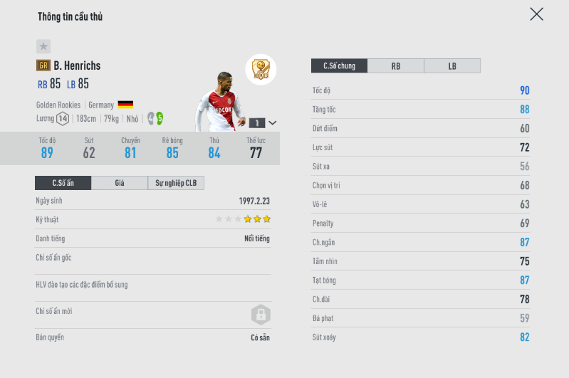 ra mắt đã 3 năm, nhưng Henrichs đến giờ vẫn đứng vững trong bảng xếp hạng RB LB đủ thấy cầu thủ người Đức có độ ổn định cao như thế nào. Chiều cao tốt, tốc độ và chỉ sổ tổng quát thấp là lợi thế cho các HLV nâng cấp +8 cho Henrichs dễ dàng hơn. Mặc dù không hề khan hiếm hàng nhưng muốn mua được lại không hề dễ dàng chút nào.