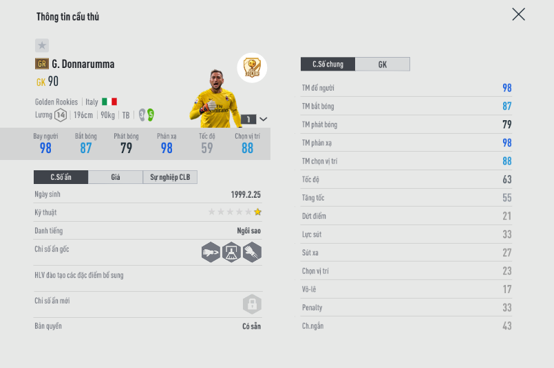 Nếu bạn cần một thủ môn "ảo tung chảo" thì hay thử qua Donnarumma GR nhé. Đừng ngại mức lương 14 của anh chàng to con này, không phải ngẫu nhiên mà thủ thành của PSG lại có tên trong danh sách Golden Boy đâu. Cảm giác khi đối đầu với Donnarumma từ chỗ khó chịu chuyển qua ức chế cực nhanh dành cho đối thủ