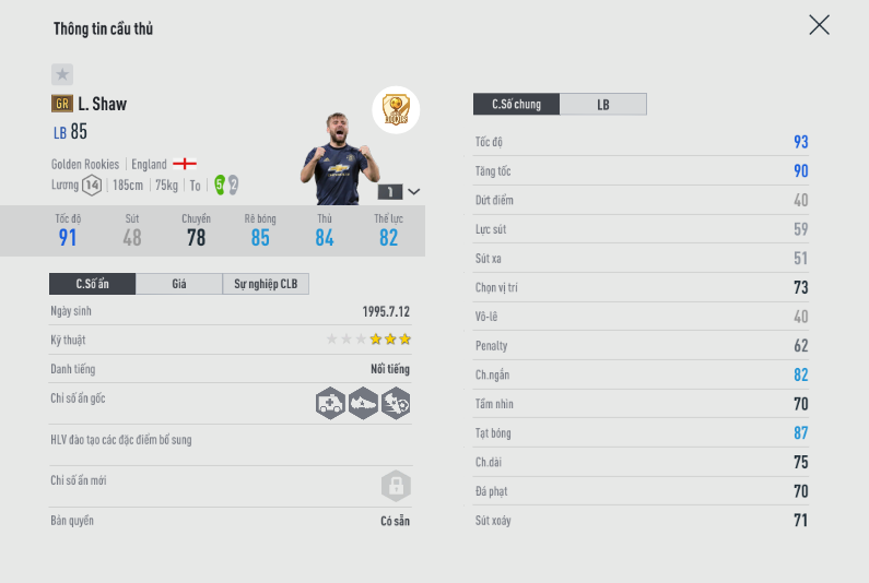 Shaw là một cái tên được ưa chuộng không chỉ fan MU mà còn đa số người chơi FO4 bởi có khá ít hậu vệ cánh cho thể hình tốt mà lại có ma tốc độ như cầu thủ của MU. AI phòng ngự cũng ở mức tốt tuy đôi lúc còn có chút ngáo ngơ. Nhưng sự hài hòa trong công thủ, đặc biệt là có thể lấy thịt đè người với các tiền đạo cánh của đối phương.