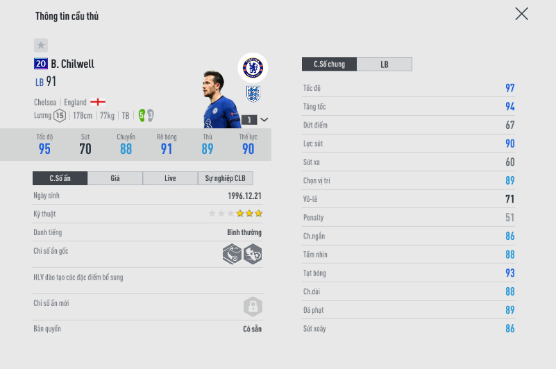 Hậu vẹ cánh người Anh là một cái tên rất hot sau meta 6.0 khi mà anh có chiều cao và cân nặng có thể cân được các tiền đạo chạy cánh top hiện nay. Thêm vào đó chỉ số ẩn ma tốc độ giúp cho Chilwell hỗ trợ mặt trận tấn công rất tốt