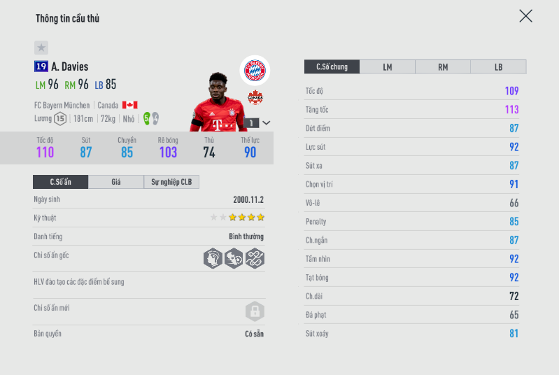 Hậu vệ trẻ người Canada được coi là người thay thế xứng đáng cho Alaba tại Bayern Munich. Tốc độ cao cùng AI có phần hơi "khôn quá" so với chỉ số chính là lý do mà Davies được đa phần các tuyển thủ ưa dùng, khi phòng ngự và tấn công, anh đều làm quá tốt
