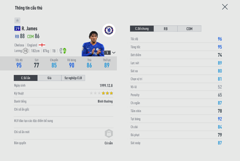 Nếu bạn cần một hậu vệ cánh có thừa sức mạnh và sức trẻ thì Reece James là một lựa chọn không thể tốt hơn, cầu thủ có khả năng đấm nhau với mọi thể loại là một chốt chặn an toàn nơi hành lang cánh phái. Không sở hữu kỹ năng phòng ngự như những cái tên kể trên nhưng Reece lại là cái tên dễ chơi và dễ điều khiển hơn cả.