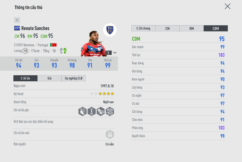 Cầu thủ người Bồ Đào Nha từng được rất kỳ vọng trong game, nhưng rồi vấn đề lớn nhất của anh là thể hình lại là vật cản quá lớn dành cho những HLV sử dụng, Renato Sanches dần bị trôi vào quên lãng. Nhưng gameplay 6.0 sẽ thổi một làn gió mới cho anh. Khi khả năng xâm nhập vòng cấm và xông xáo của anh được buff lên khá nhiều.