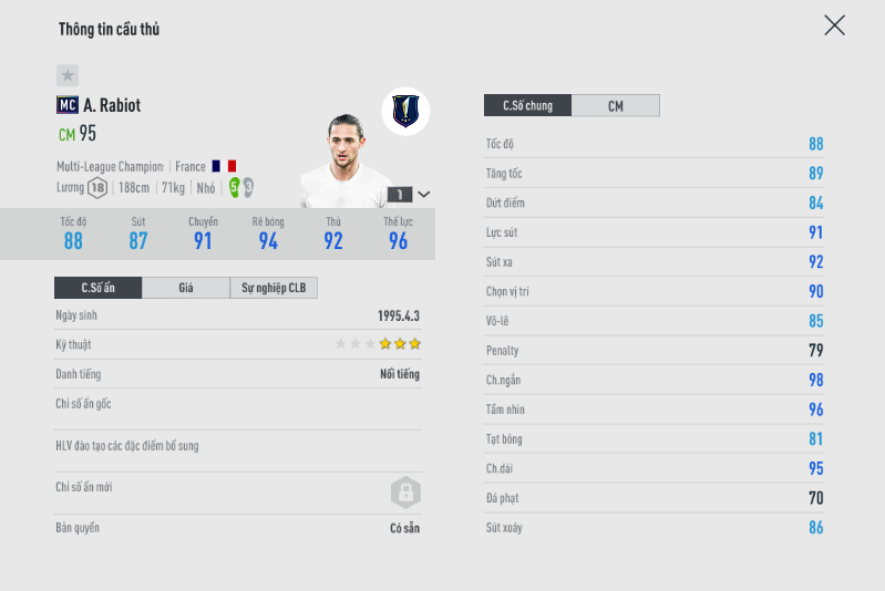 Cầu thủ người Pháp mùa MC giảm tới 9kg. Và tỏ ra khá yếu đuối trong các tình huống tranh chấp, vì vậy nếu bạn nghĩ việc mua anh về đánh nhau thì bỏ ngay nhé. Ngược lại khả năng đón bóng cũng như xâm nhập của Rabiot lại được nâng cấp lên khá nhiều.